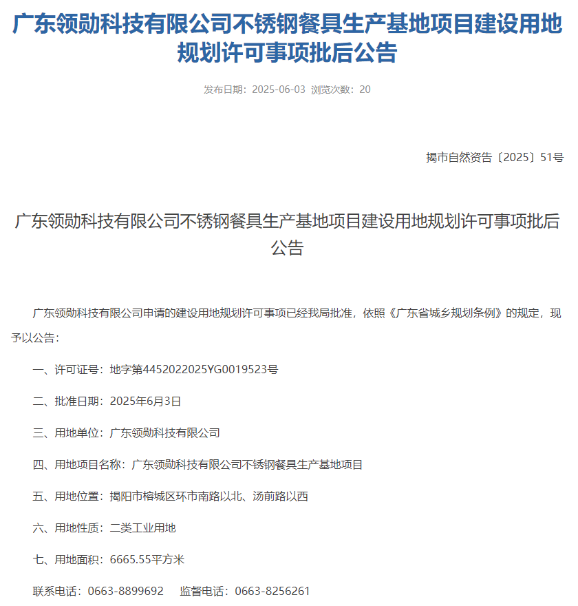 2025年6月3日,揭陽市自然資源局就廣東領勛科技有限公司不銹鋼餐具生產基地項目建設用地規劃許可事項作出批后公告。