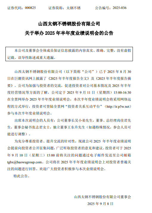 2025年9月8日,據(jù)《山西太鋼不銹鋼股份有限公司關(guān)于舉辦2025年半年度業(yè)績說明會的公告》顯示,公司定于2025年9月11日(星期四)15:00-16:30在全景網(wǎng)舉辦 2025年半年度業(yè)績說明會。