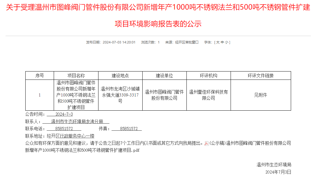 7月3日,溫州市生態(tài)環(huán)境局龍灣分局受理溫州市圖峰閥門管件股份有限公司新增年產(chǎn)1000噸不銹鋼法蘭和500噸不銹鋼管件擴(kuò)建項(xiàng)目環(huán)境影響報告表并對外進(jìn)行公示,公示期:7個工作日。