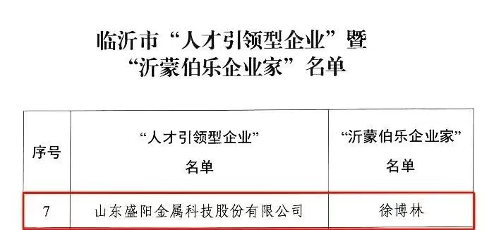 其中,山東盛陽金屬科技被評選為“人才引領(lǐng)型企業(yè)”,集團總裁徐博林被授予“沂蒙伯樂企業(yè)家”榮譽稱號。